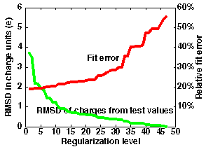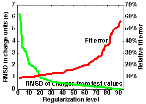 However, the most accurate effective charges deviate from "reasonable" test charge values (+-0.5,1.0) by 3.5 units on average. Examination of the error curve shows that if the regularization level is chosen at N=20, the error in the potential is only 23%, and the charges deviate from test charge values by an average of only 0.6 units (and have a maximal deviation (RM1D) of 1.9 - this is seen from the output of ecm_regularize). - Better accuracy of 20% is given by N=10, with an RMSD for effective charges of 1.2 and an RM1D of 3.2.