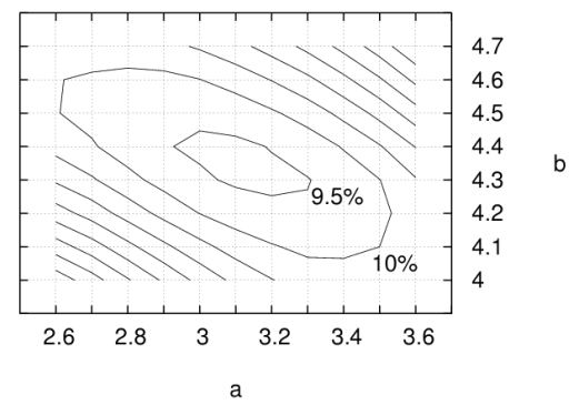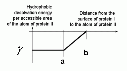 In SDA, the solvent accessibility values of the atoms of one solute are multiplied by the nonpolar desolvation values of the other solute. As shown in the plot below, there are several different values of parameters a and b that give the buried areas to an accuracy of ca 10%. We recommend using the values: a =3.10, b = 4.35, and factor = 0.5.