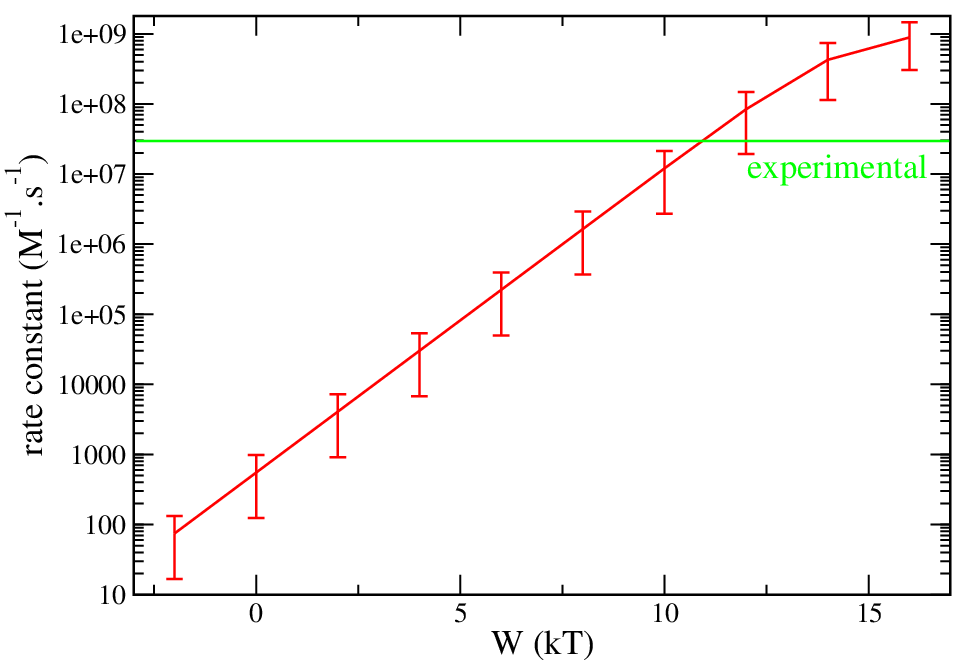 parameters from the paper: W (in units of kT) of 10.4 reproduce experimental data (2.7E10+7 1/(M.s))